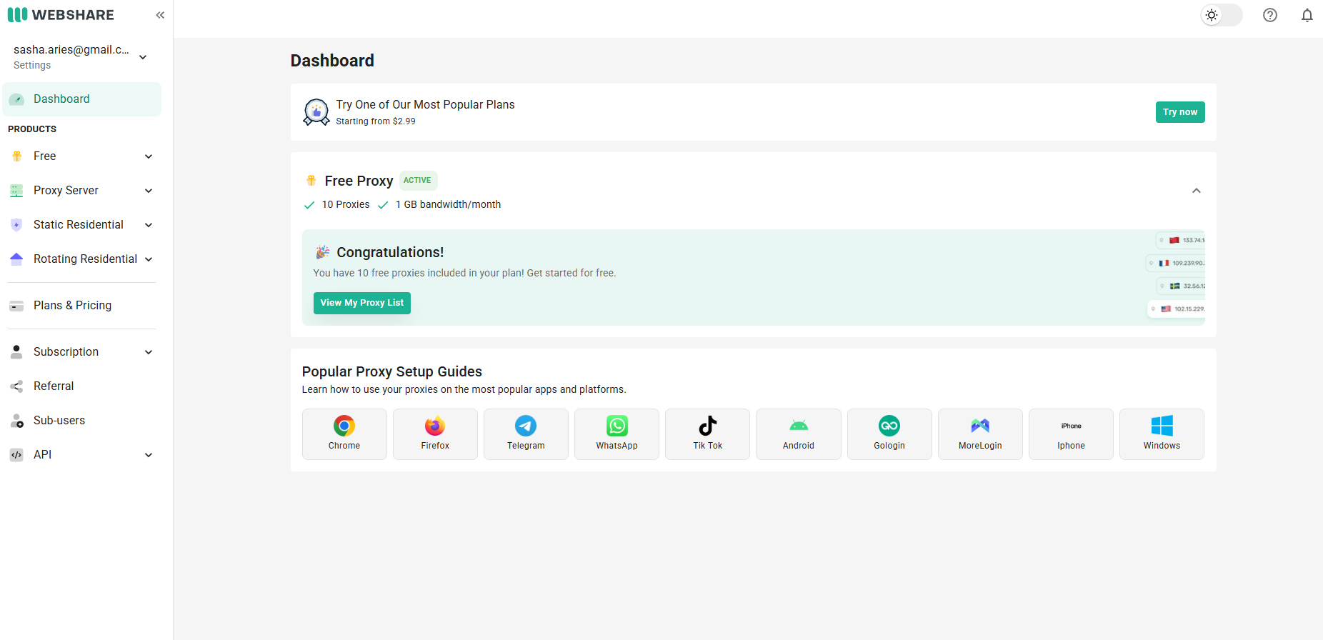 Webshare | Datacenter, Static Residential, Rotating Residential | No | No | Small setups, testing | From $2.99/month |