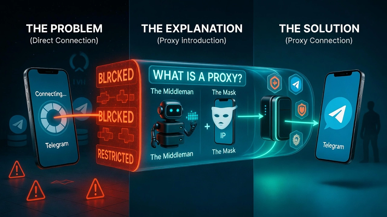 For Telegram specifically, a proxy server solves three distinct problems. First, it can route your connection around government or ISP-level blocks. If Telegram's servers are unreachable from your network, a proxy in an unrestricted country can reach them on your behalf. Second, it masks your real IP address, adding a layer of privacy.