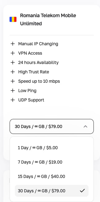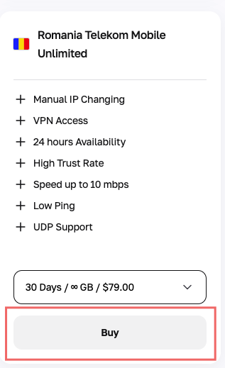 • Place an order by selecting the proxy duration and clicking the "Buy" button.