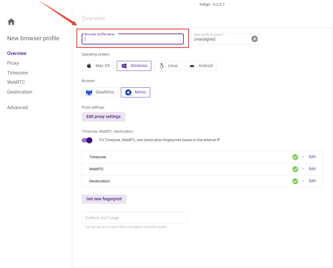 - Profile Name: Enter a profile name convenient for you (e.g., MyIndigoProfile).