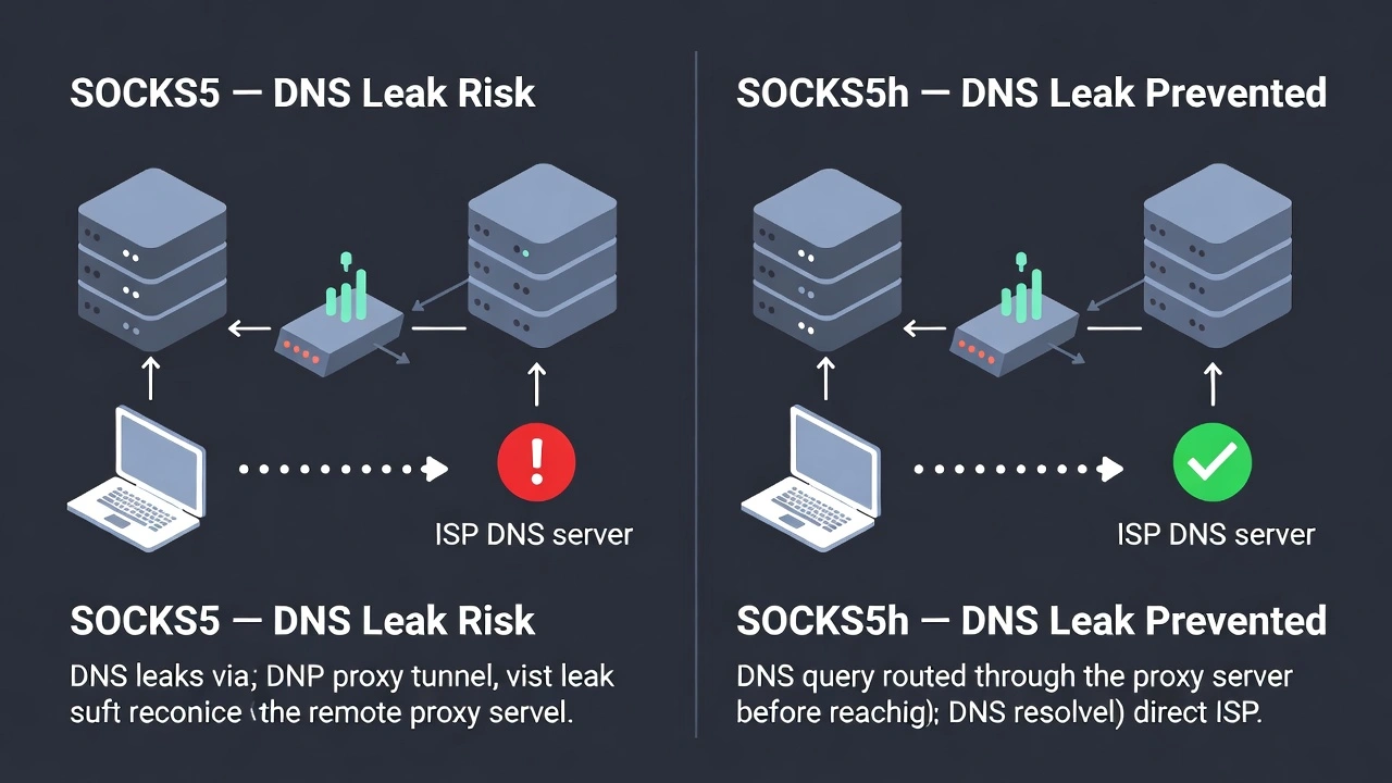 Use socks5h whenever privacy is a concern, and you want DNS queries routed through the proxy rather than resolved locally. Use socks5 when local DNS resolution is acceptable, and you want slightly lower latency (one fewer round trip for DNS). For most privacy-sensitive applications, socks5h is the safer default.