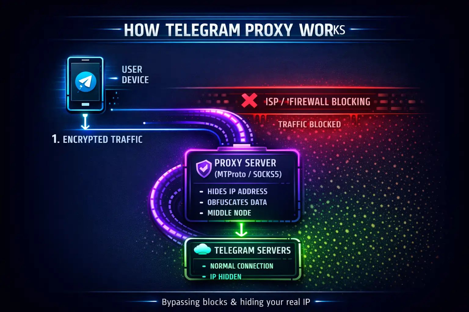 A Telegram proxy server sits between your device and Telegram’s servers, routing your connection through a different IP address. From Telegram’s perspective, your traffic no longer comes from your real device; it comes from the proxy. This allows you to bypass blocks, restore access on restricted networks, and keep connections stable even when your original IP is flagged or limited.