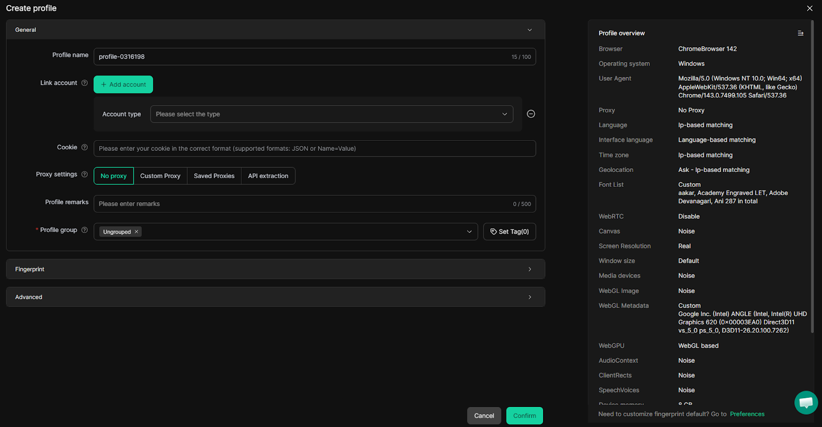 Más allá del proxy, el editor de huellas digitales de perfil de DICloak le permite personalizar:
