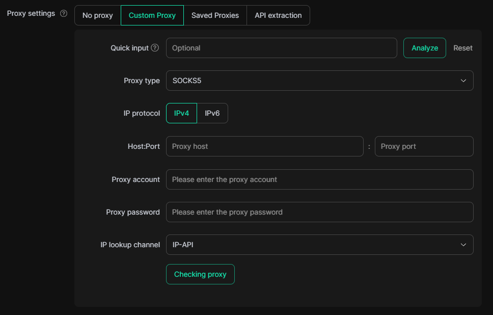 Aquí, puede especificar la información del proxy utilizando el mismo menú de entrada y, a continuación, seleccionar el proxy de la lista de Proxies guardados al crear o editar cualquier perfil.