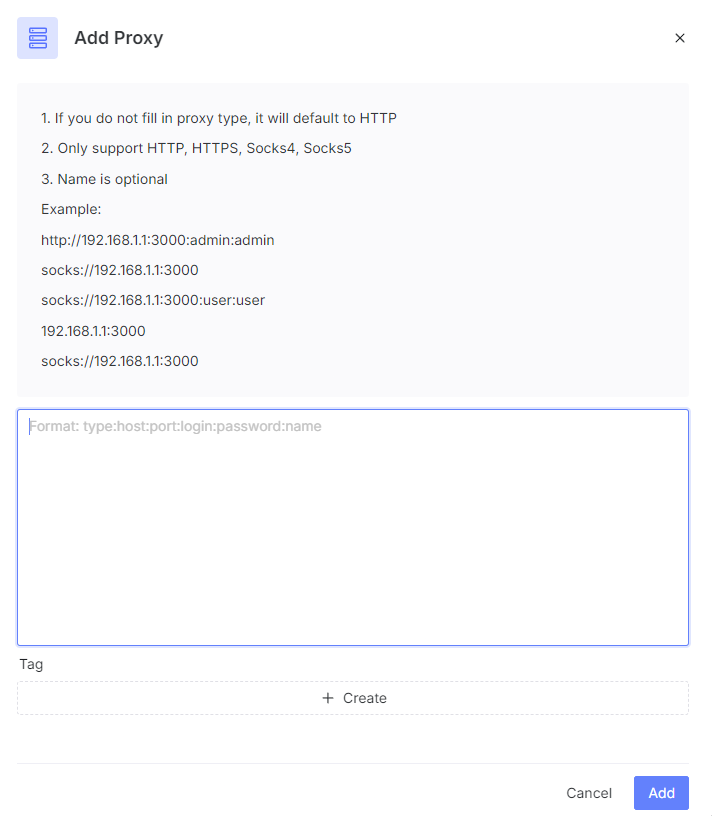 Pegarhasta 100 proxies a la vez, uno por línea, en el formato //http:host:port:username:password o //socks5:host:port:username:password.