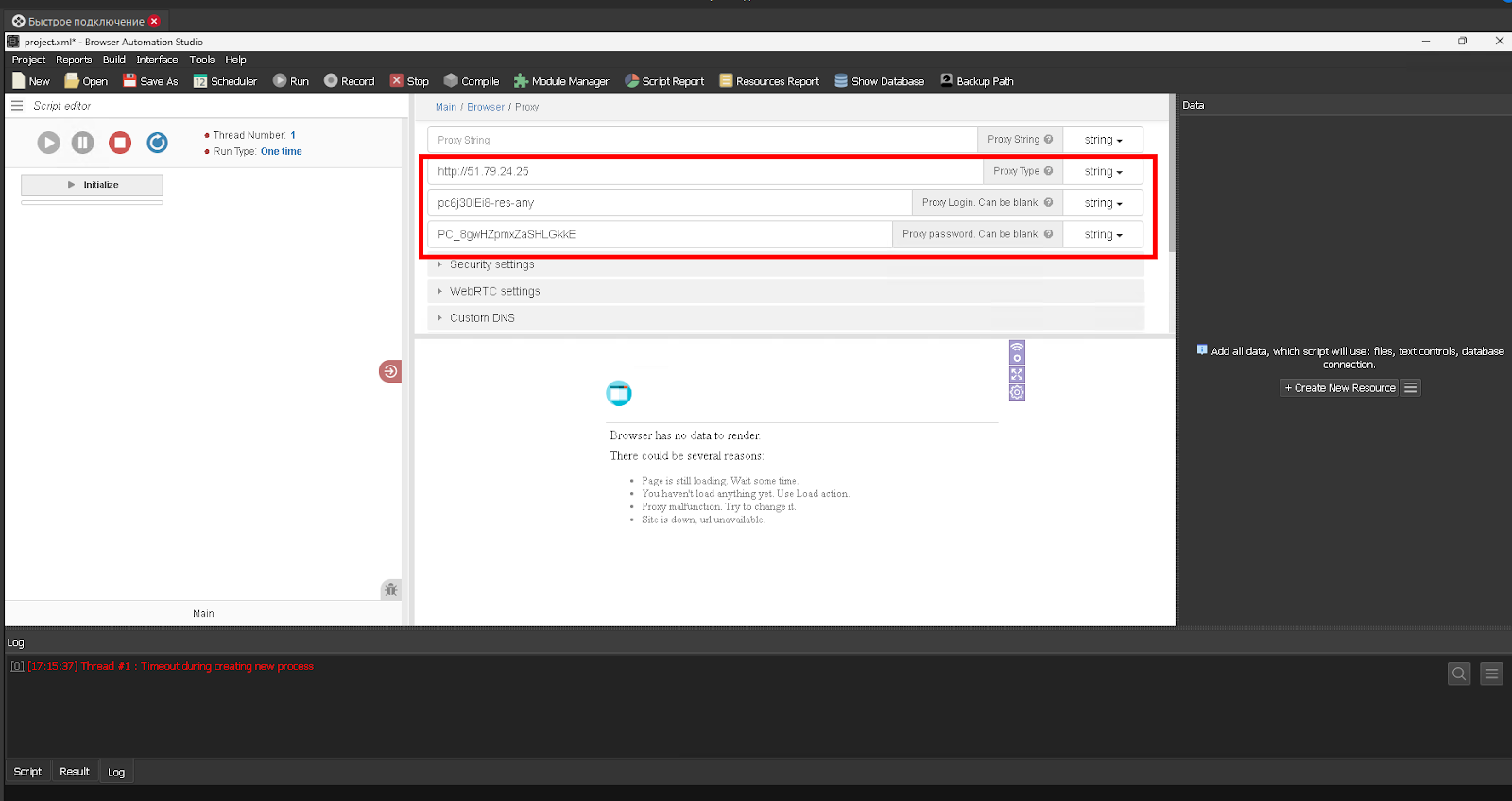 Fig. 6. Configuración del servidor proxy en el software Browser Automation Studio.