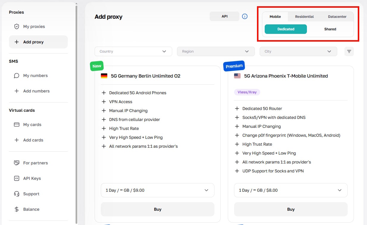 Go to your CyberYozh account, click on Add proxy, and select the proxy type you need (mobile, residential, or datacenter).