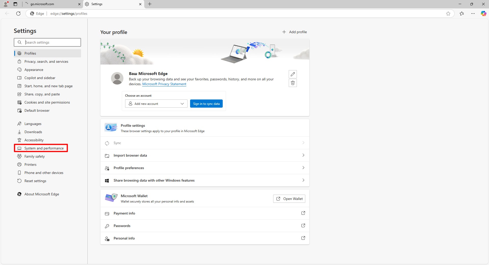 Fig. 2. Edge settings menuIn the left menu, select the "System and performance" section.
