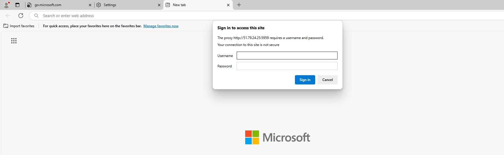 Go back to the Edge browser and try to open any website (e.g., google.com). The browser will show a system window for entering your login and password.