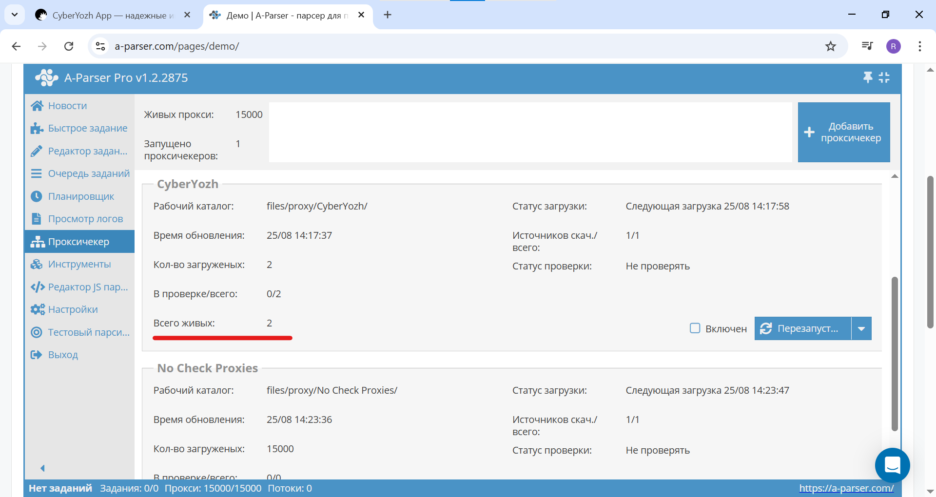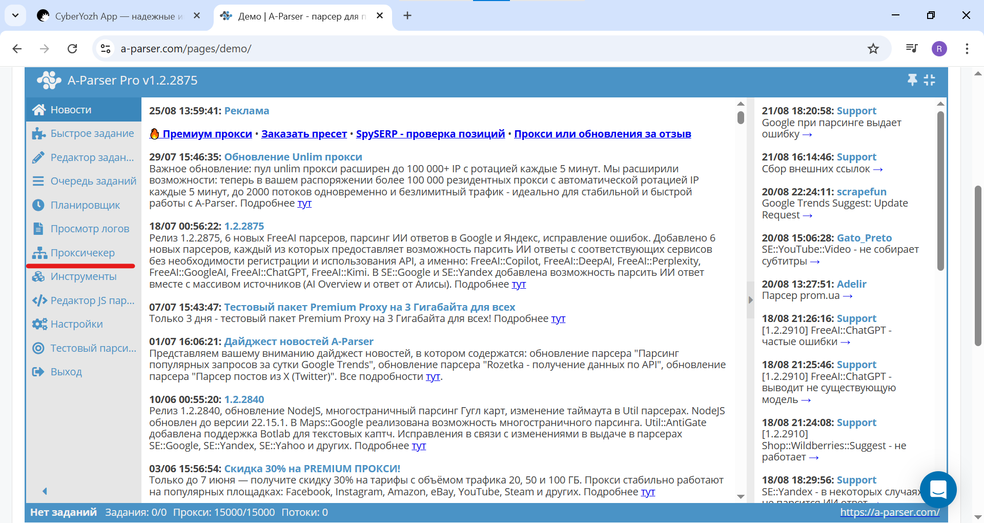 Fig. 2. Screenshot of the main A-Parser Pro interface showing the menu location. To begin, go to the "Proxy Checker" section.