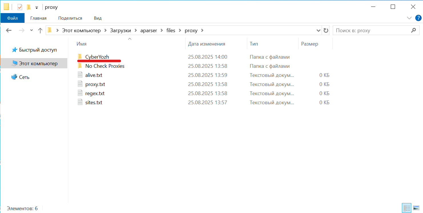 Fig. 10. Screenshot of the file manager showing the A-Parser folder structure. A folder named "CyberYozh" was automatically created for the preset, where the proxy.txt file should be placed.