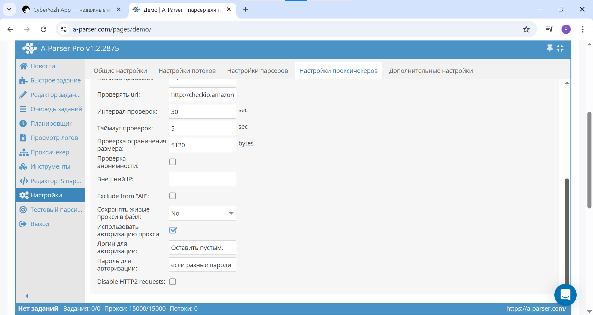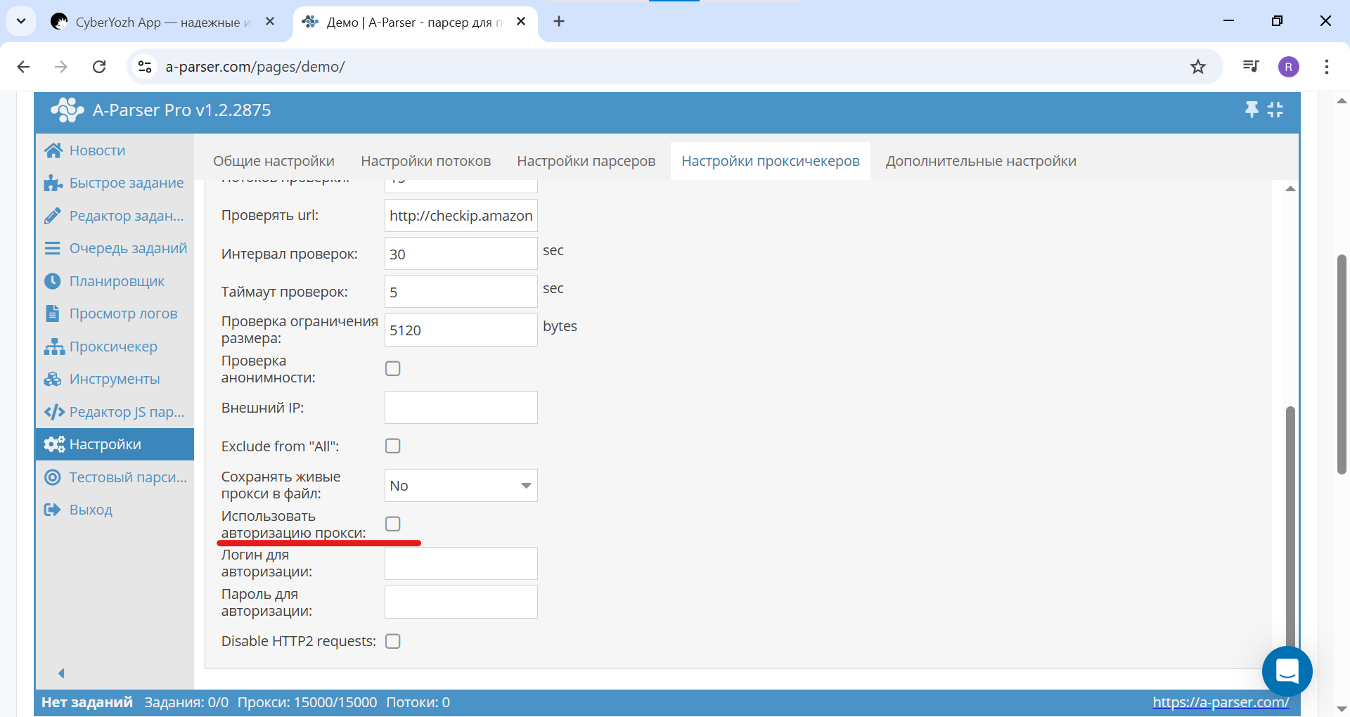 Fig. 7. Screenshot of the proxy checker settings in A-Parser, showing the activation of the "Use proxy authentication" option.
