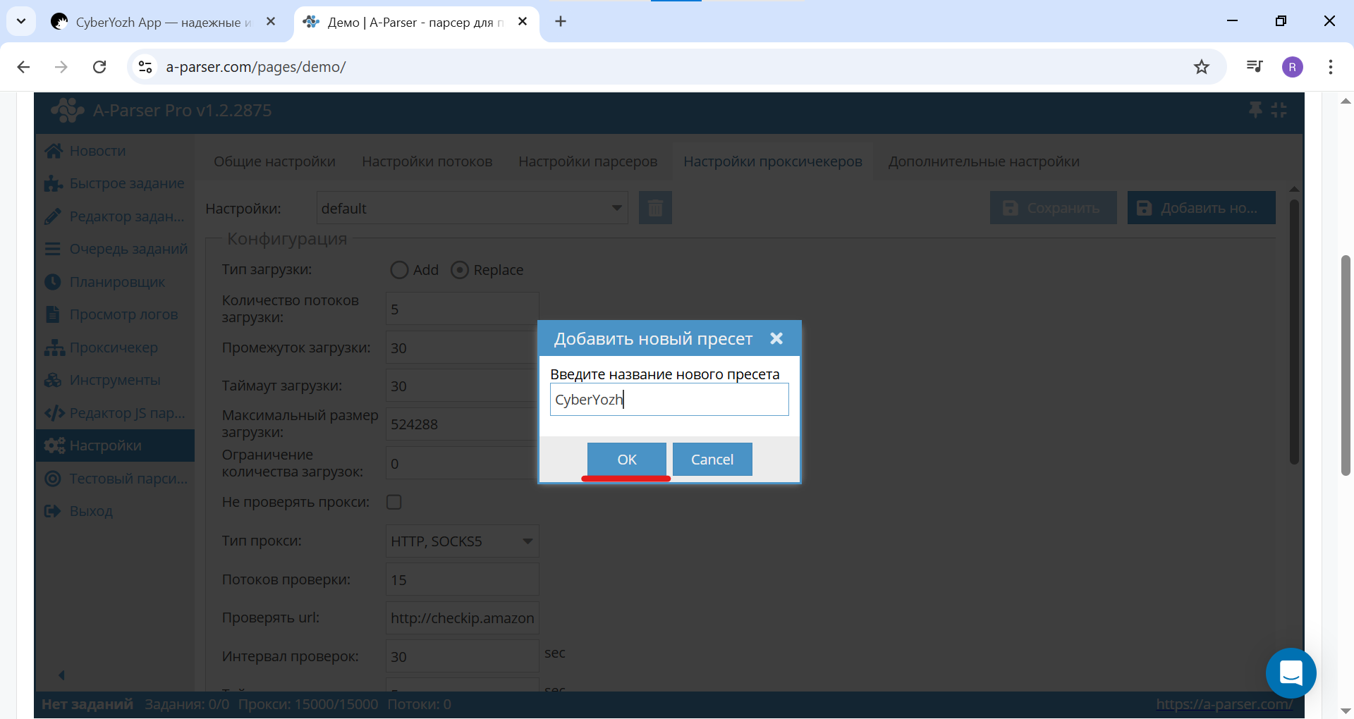 Fig. 5. Screenshot of the dialog window in A-Parser, demonstrating the process of creating a new preset named "CyberYozh".