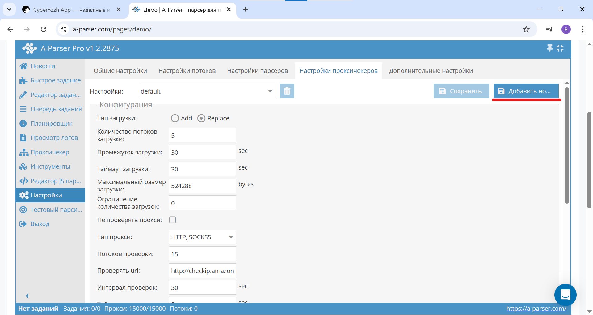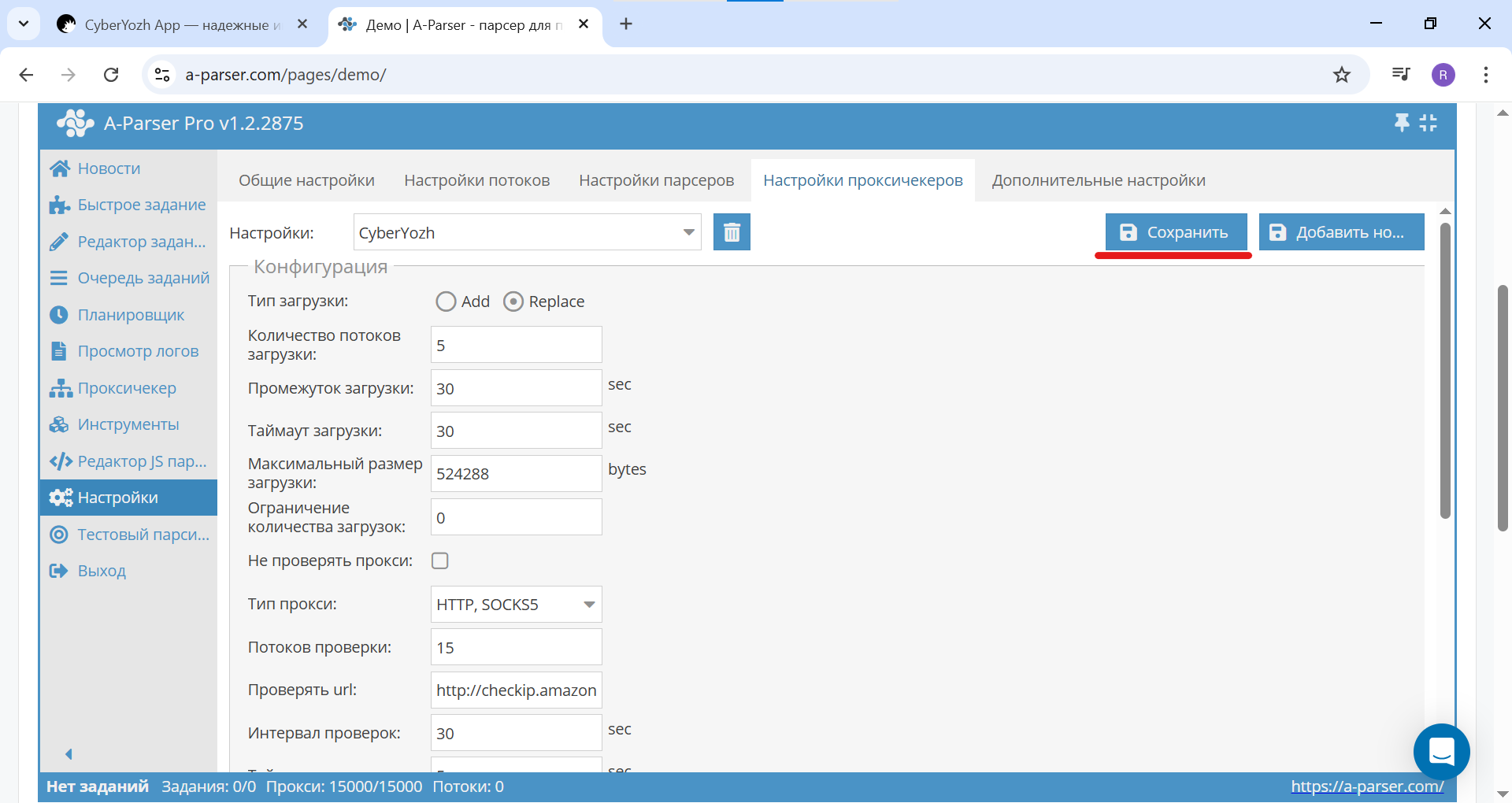 Fig. 9. Screenshot of the proxy checker settings in A-Parser, showing the location of the "Save" button.