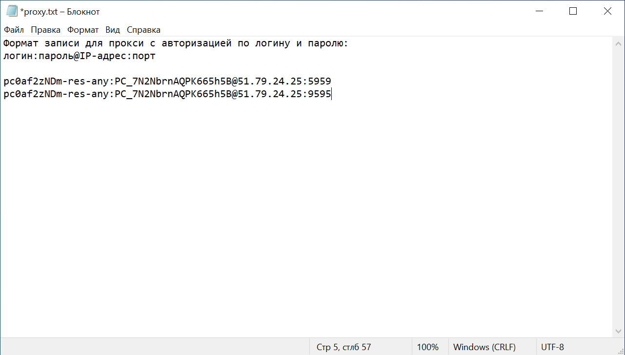Fig. 11. Screenshot of the proxy.txt file, demonstrating the correct data format for proxies with authentication: login:password@IP-address:port.