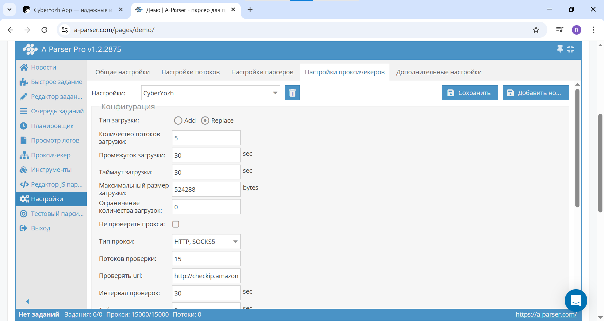 Fig. 12. Screenshot of the "Proxy Checker" section in A-Parser, showing the addition of a new proxy checker using the created preset.