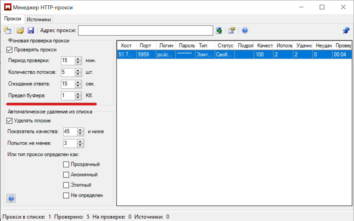 Fig. 11. "Buffer Limit" option, allowing to filter out servers returning excessive information garbage. Quality Ratio (Remove Bad): Enable this option. "Magadan" calculates proxy quality as the percentage of successful requests. If a server returns nothing but errors after several attempts, the program will automatically remove it from the worklist to avoid skewing the semantic collection statistics.