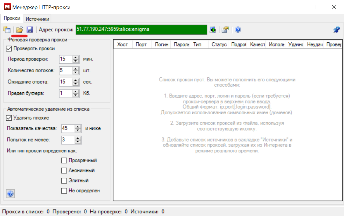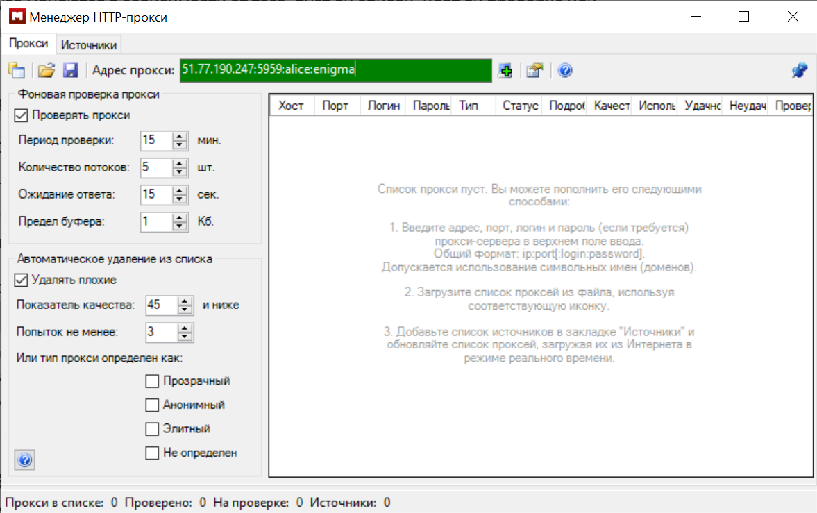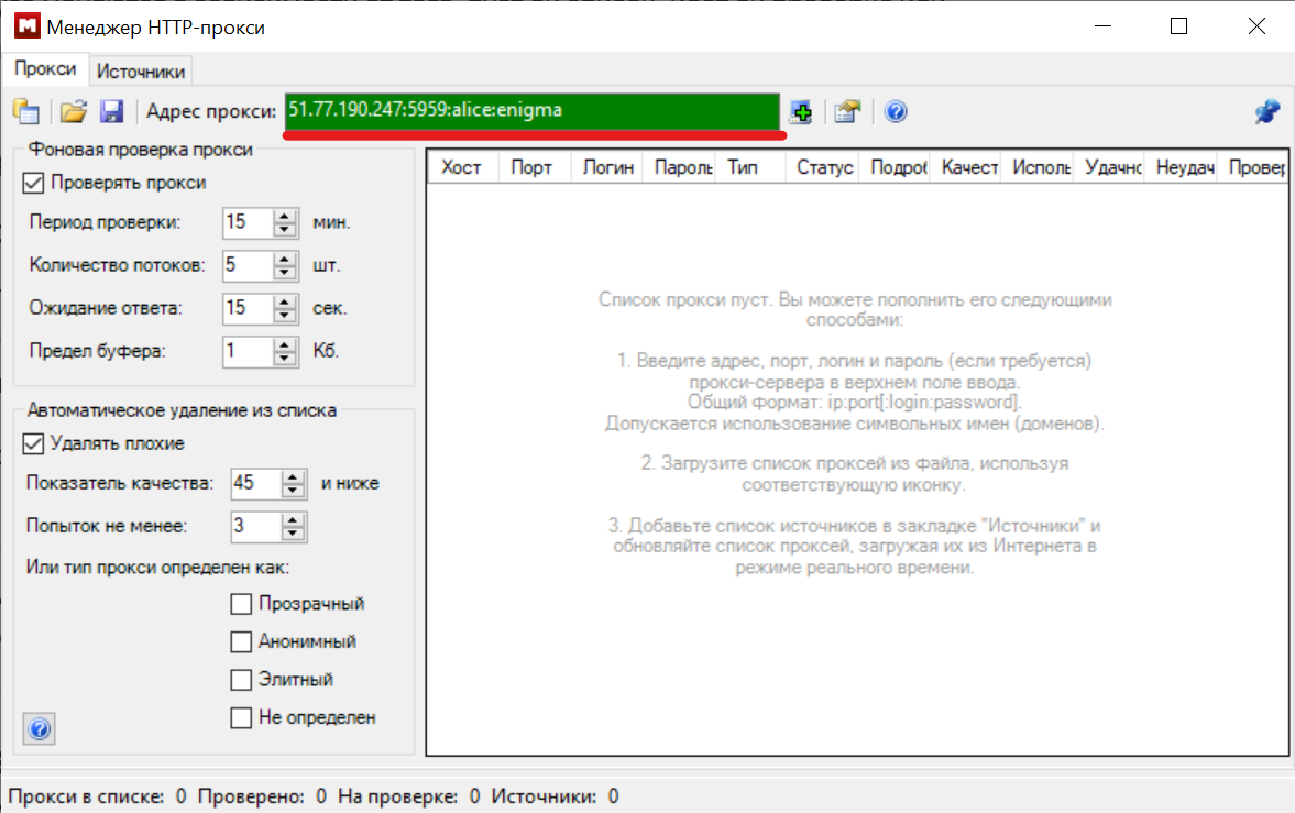 For example, an elite residential proxy with authentication would look like this: 51.77.190.247:5959:alice:enigma (where alice is the login and enigma is the password). Addresses can be loaded in several ways: