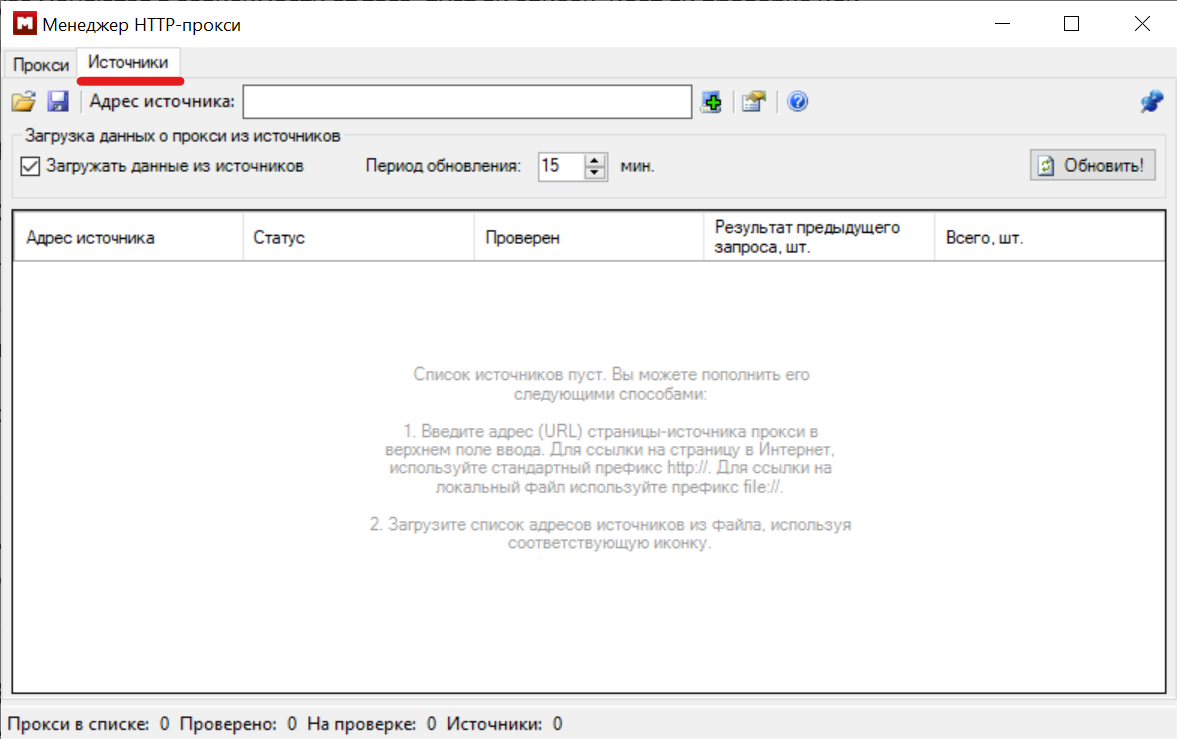 Fig. 8. "Sources" tab for configuring automatic proxy collection from specified URLs.