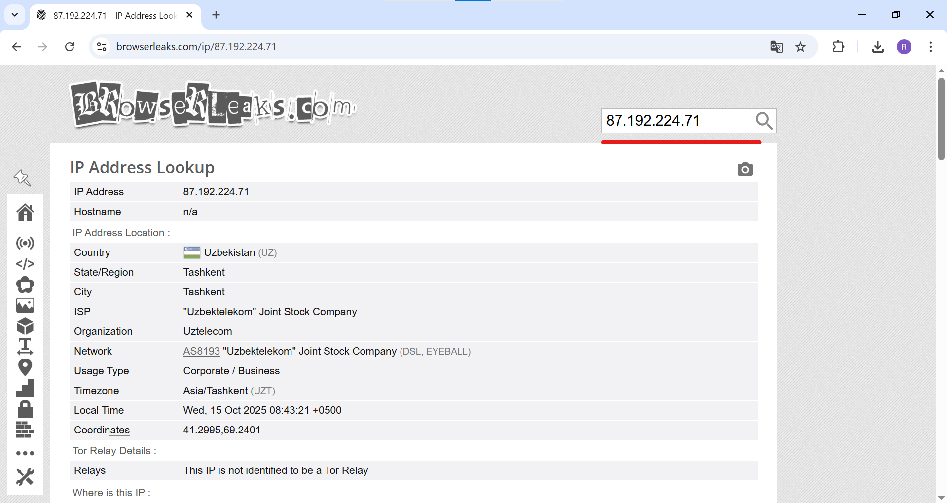 Fig. 10. This screenshot shows an example of checking the external IP address 87.192.224.71 via the browserleaks.com service, allowing you to verify which IP the end server sees.