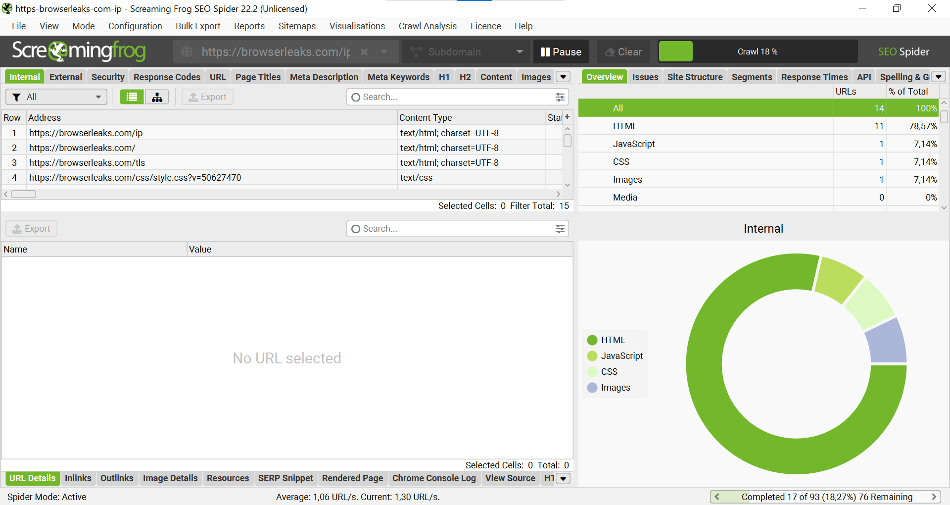 https://browserleaks.com/ip. This will allow us to see exactly which IP address the request from Screaming Frog is coming from. - Paste this URL into the main field and click "Start".