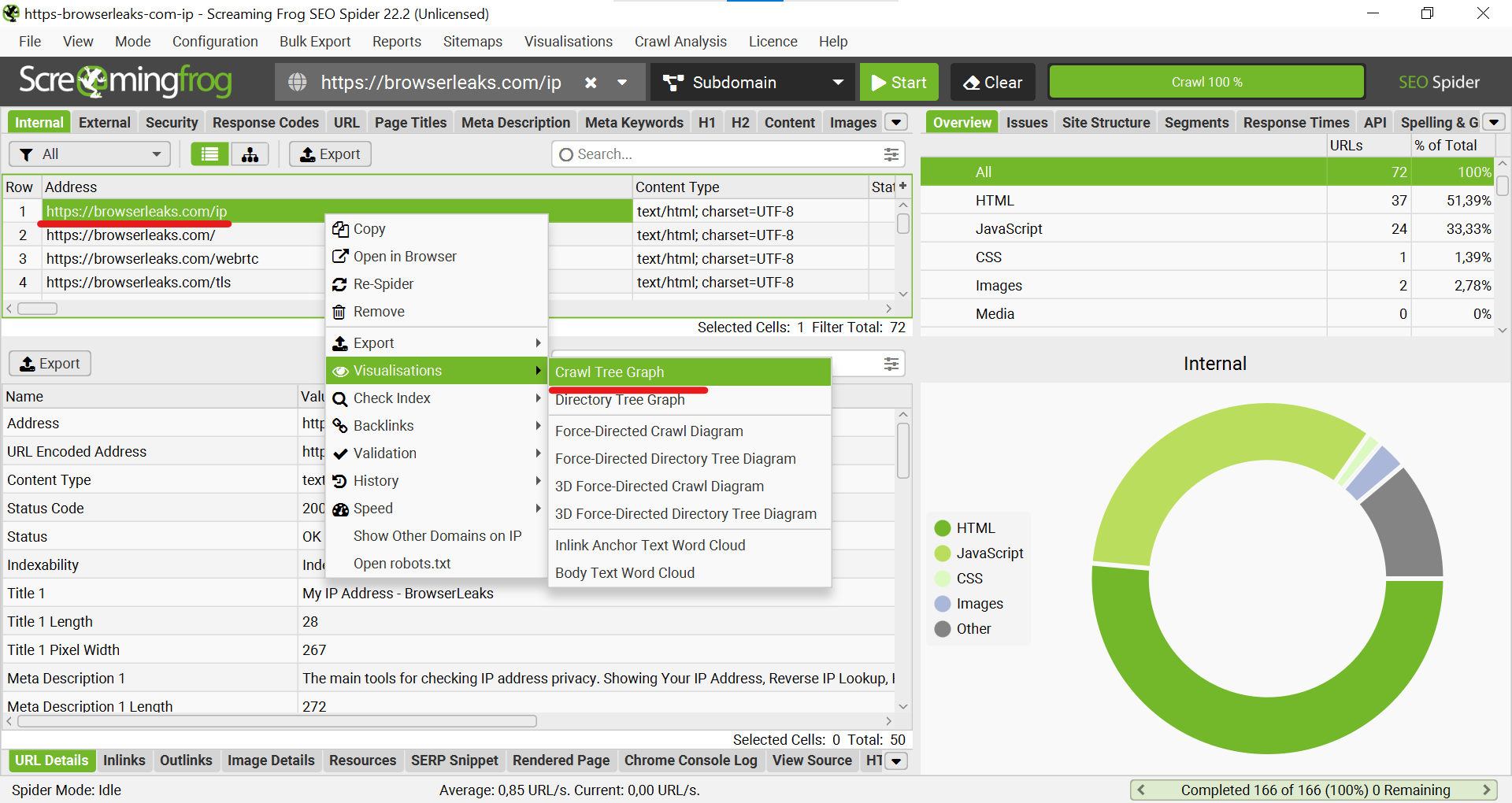 Fig. 8. This screenshot shows a method for visualizing results: "Visualisations" -> "Crawl Tree Graph" is selected via the context menu for the main URL.