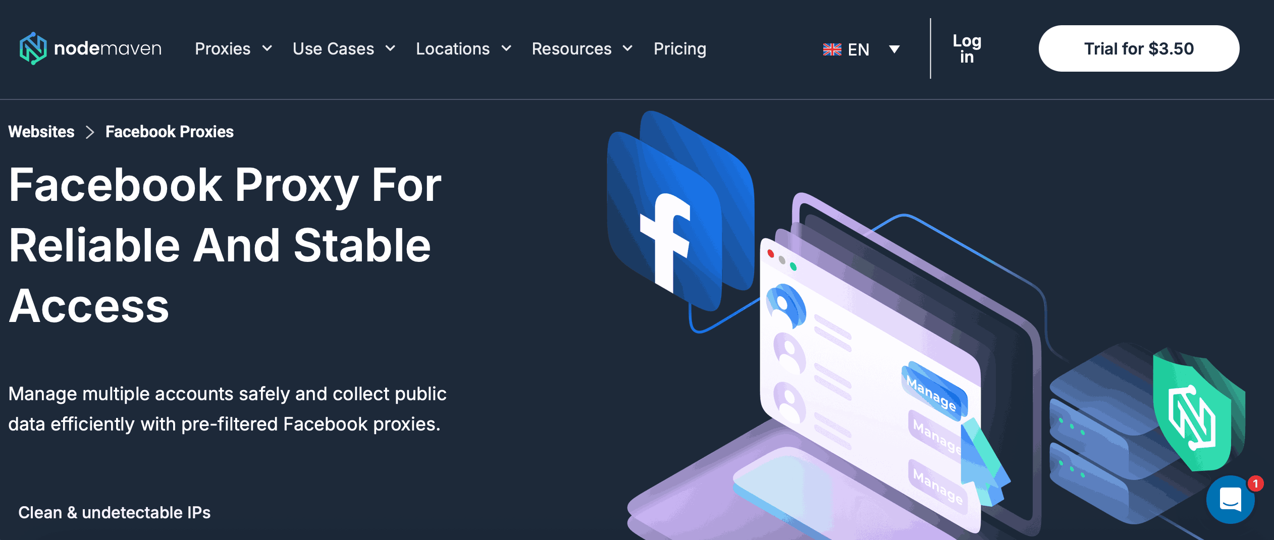 Proxy residensial NodeMaven cocok untuk berbagai tugas, termasuk proses Meta. Platform ini cocok untuk pengiklan Facebook yang perlu memverifikasi iklan di berbagai lokasi. Ini adalah proxy yang baik untuk mengelola akun Facebook, dan juga akan cocok untuk Anda jika ingin mengumpulkan data publik tanpa gangguan dan pemblokiran.