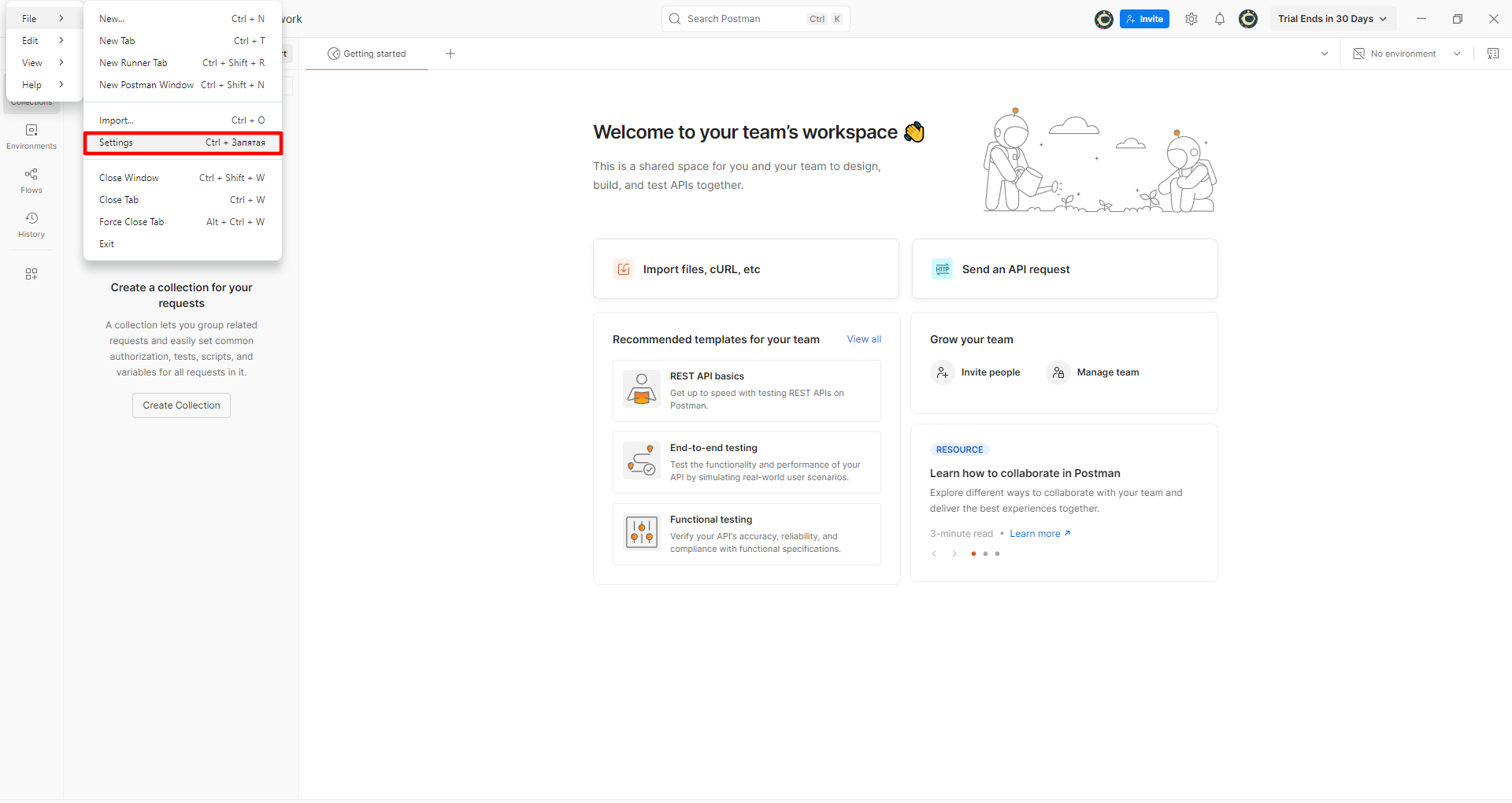 Fig. 2. Interface do menu de configurações no Postman, demonstrando o caminho de navegação para os parâmetros de proxy. A imagem mostra a localização do menu "File" (ou ícone de três linhas) no canto superior esquerdo, de onde se acessa a seção "Settings" e, em seguida, a aba "Proxy" para configuração da conexão.