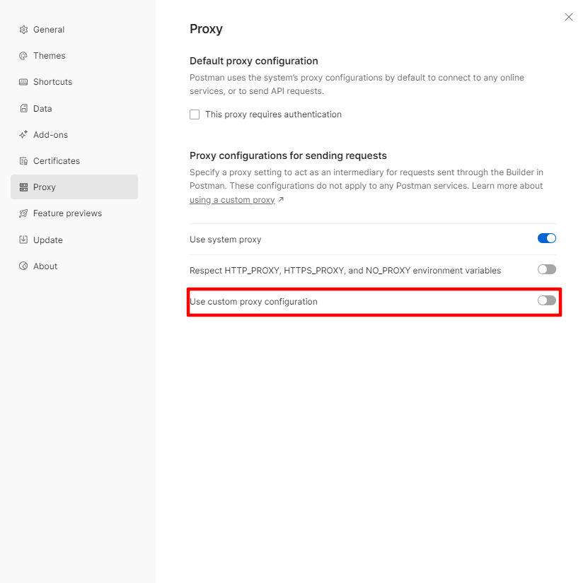 O Postman permite configurar um proxy globalmente — isso significa que todas as requisições que você enviar de qualquer coleção passarão pelo servidor especificado.