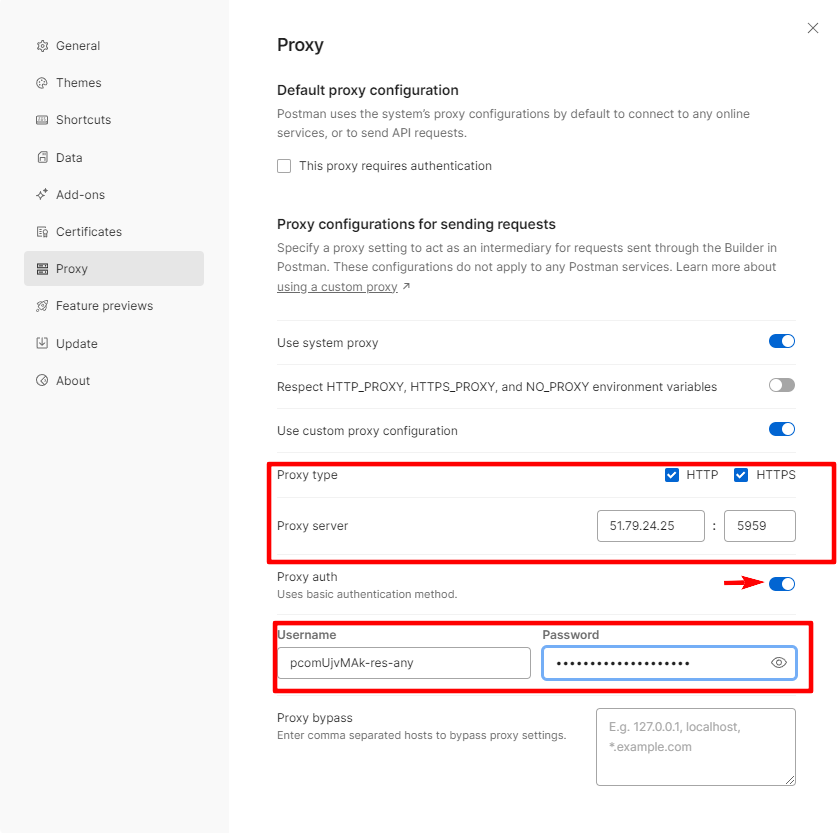 Fig. 4. Exemplo de configuração global de proxy na interface do Postman. A imagem demonstra os campos preenchidos para a conexão do proxy.Feche a janela de configurações (X). O Postman salva as alterações automaticamente.