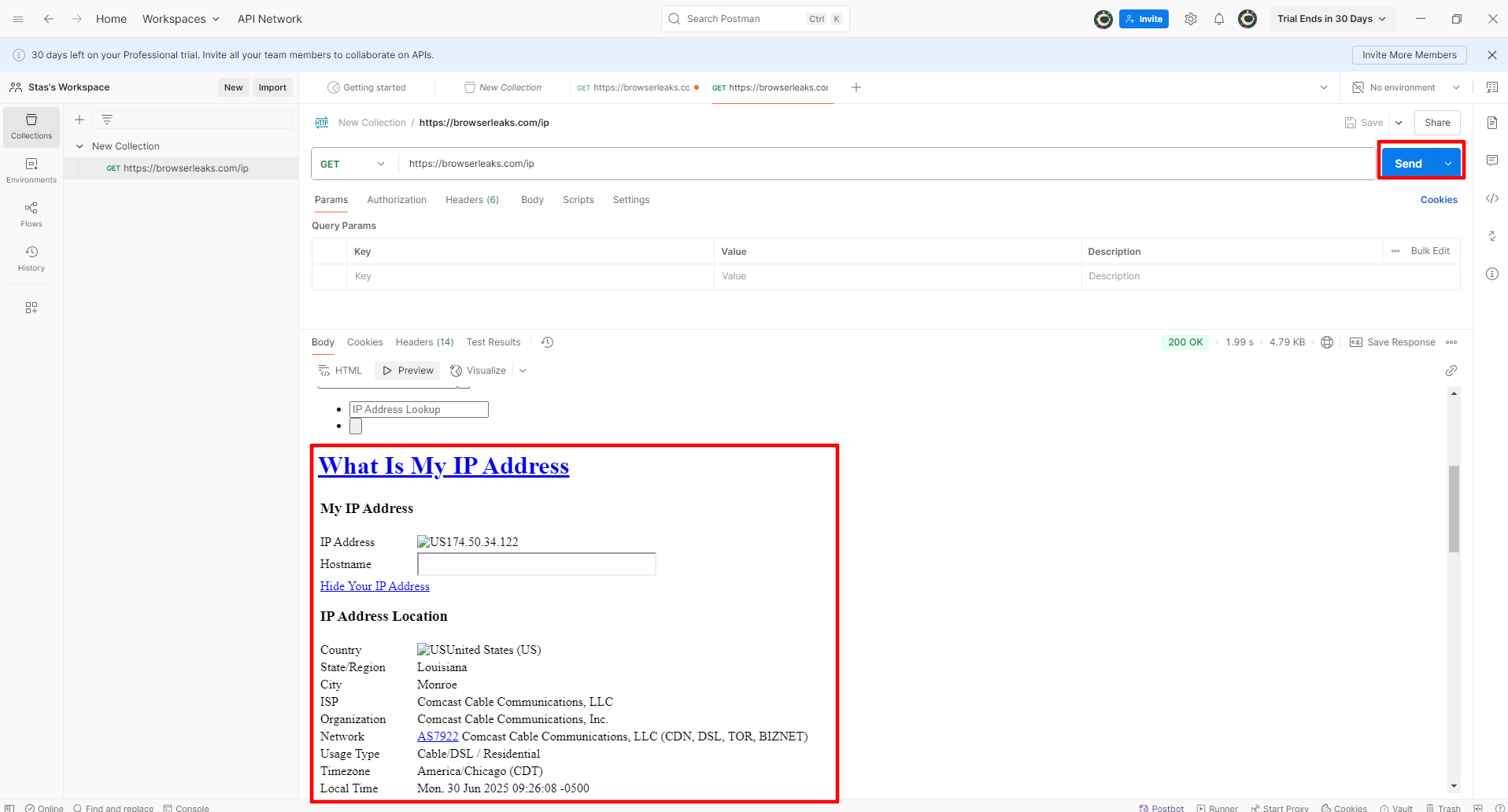 Fig. 5. A imagem exibe o endereço IP de conexão atual, confirmando o funcionamento bem-sucedido do proxy configurado no Postman.