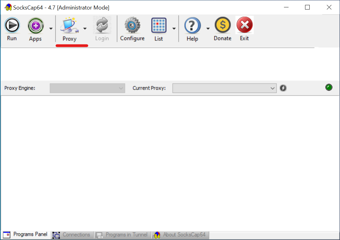 - Abrir o gestor de proxies. Na janela principal do SocksCap64, clique no ícone «Proxy».