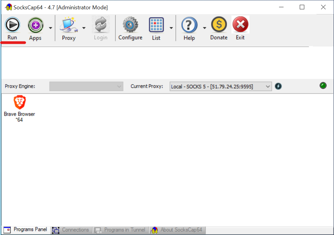Fig. 14. Captura de ecrã da interface principal do SocksCap64, demonstrando a aplicação adicionada (Brave Browser) e o botão «Run» para o seu arranque subsequente através do proxy configurado.
