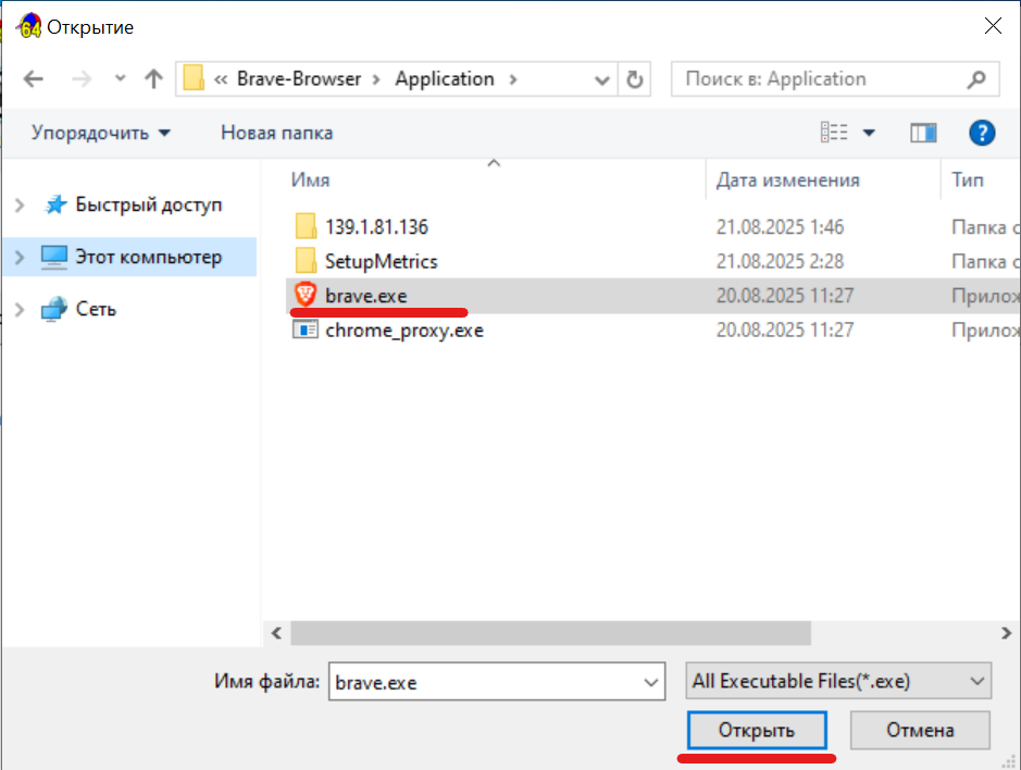 - Iniciar! Selecione o seu programa (Brave Browser) na lista e clique no botão «Run» no painel principal.