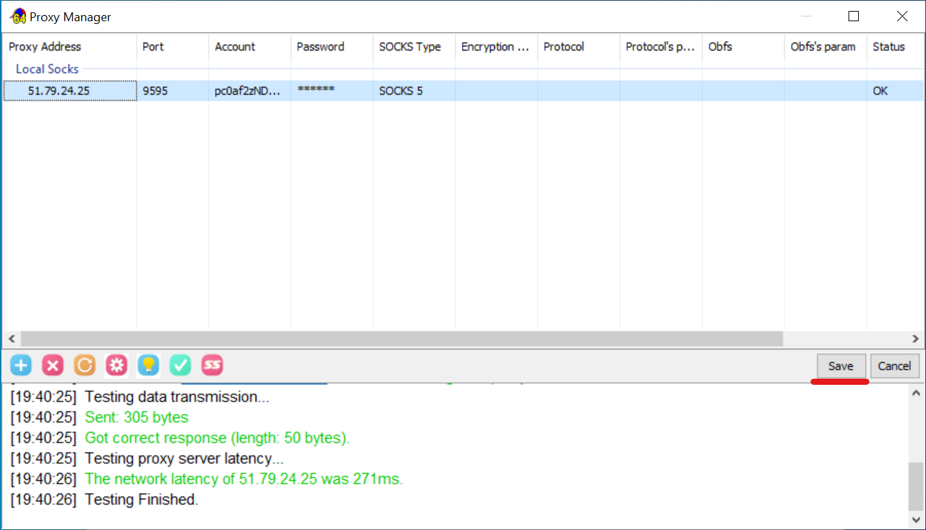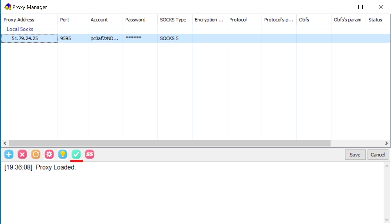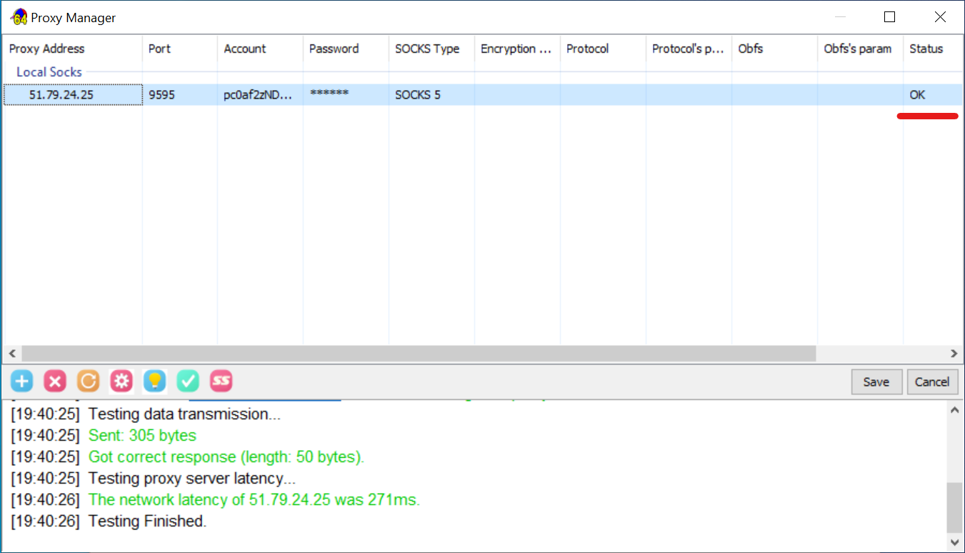 - Testar a ligação. Selecione a linha com o seu proxy e clique no ícone da marca de verificação (Test). No fundo da janela aparecerá o log de verificação. Se tudo estiver correto, aparecerá «OK» na coluna «Status».
