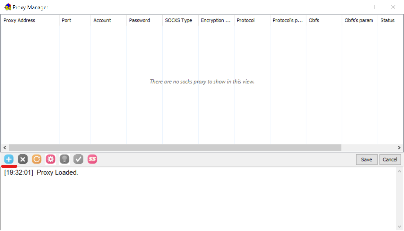 - Adicionar um novo proxy. Na janela «Proxy Manager» que se abre, clique no ícone «+» na barra de ferramentas à esquerda para adicionar uma nova linha de definições.