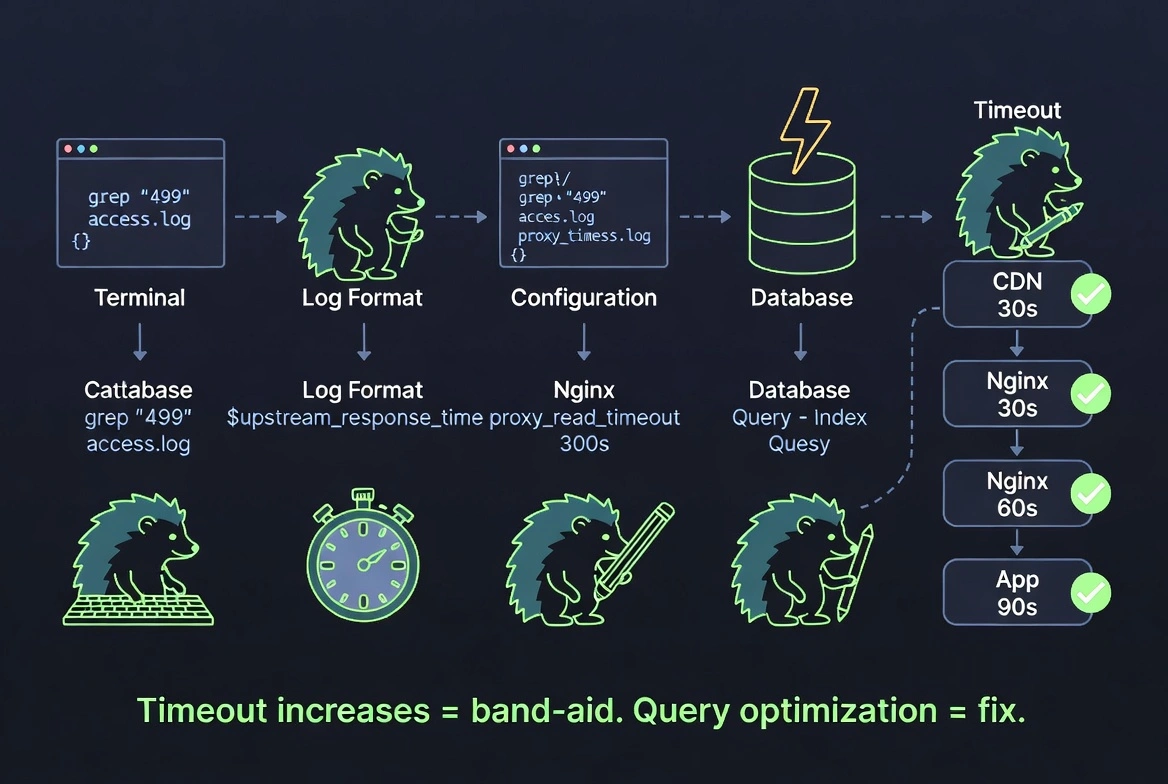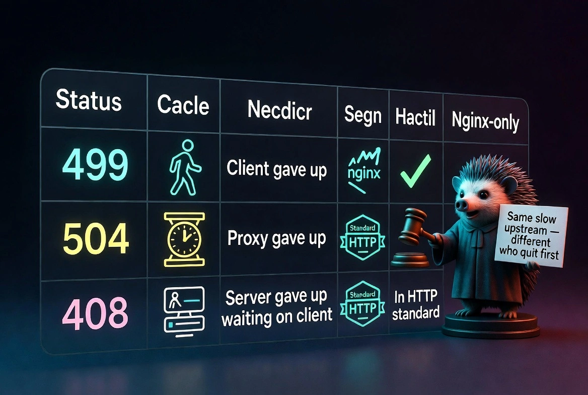 Если вы видите 504 в браузере, ваш upstream слишком медленный, и ваш прокси отказался ждать. Если вы видите 499 в логах сервера, клиент отказался раньше, чем ваш прокси. Тот же медленный upstream, разница лишь в том, кто отключился первым. [Читайте об ошибке 520 здесь.]