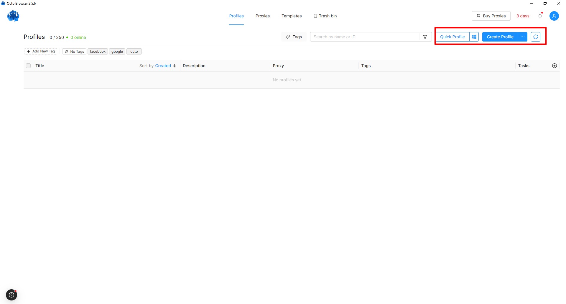 Рис. 1. Интерфейс главного экрана Octo Browser после запуска, демонстрирующий две основные функции: "Быстрый профиль" и "Новый профиль".