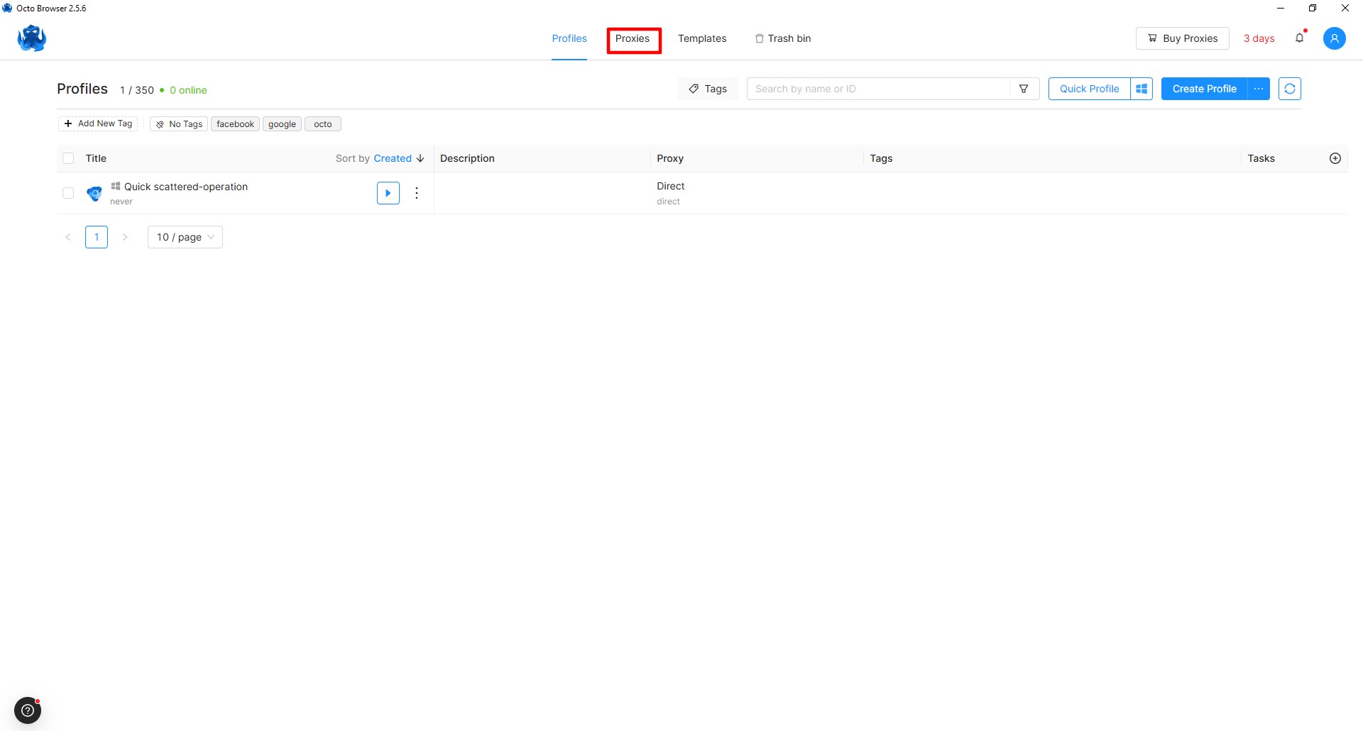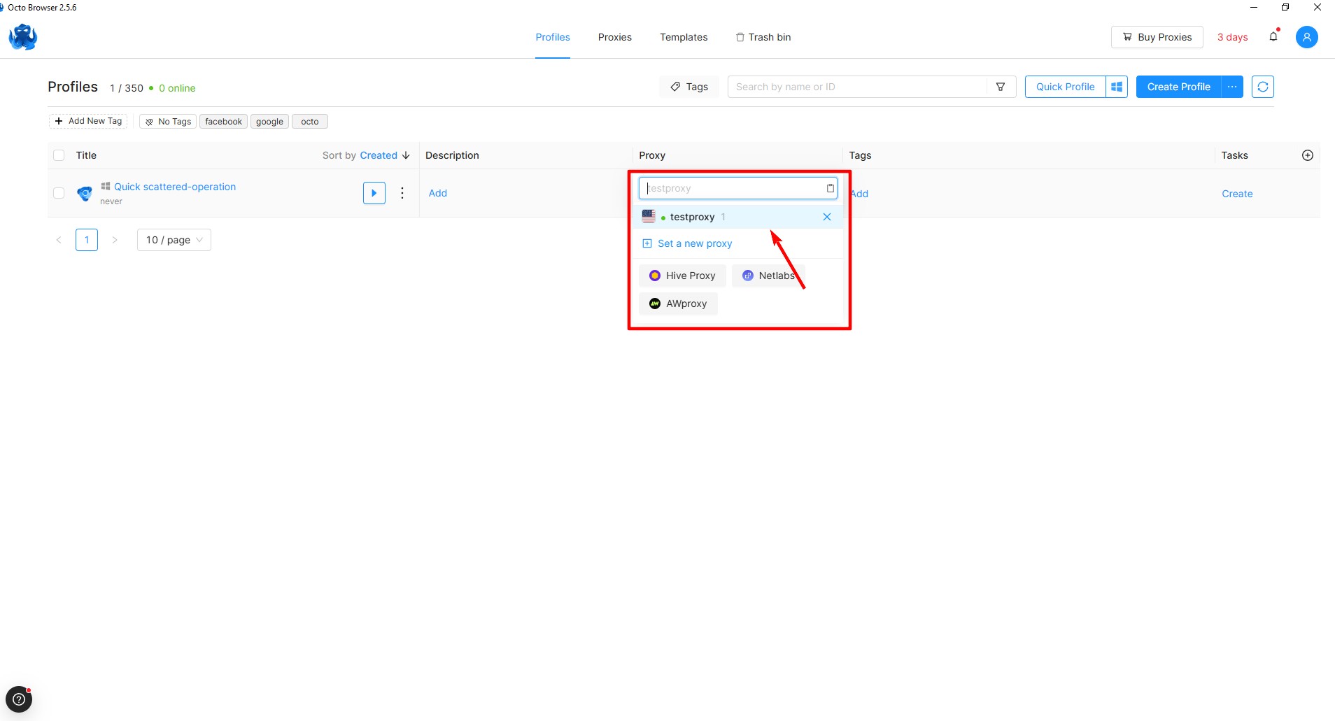Рис. 6. Визуализация статуса активного прокси-соединения в интерфейсе Octo Browser.