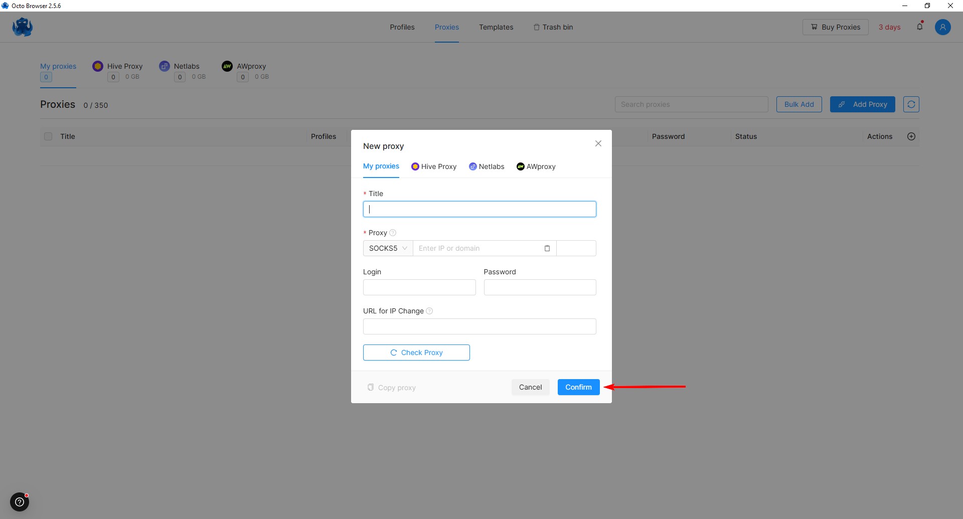 Этот способ удобен, если вы хотите сохранить прокси в базу и использовать его потом для разных профилей.