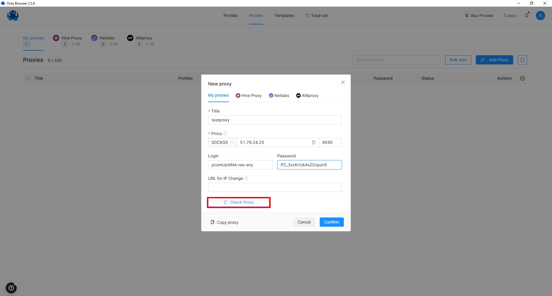 - Нажмите Check Proxy (Проверить). Если IP стал зелёным — прокси работает.