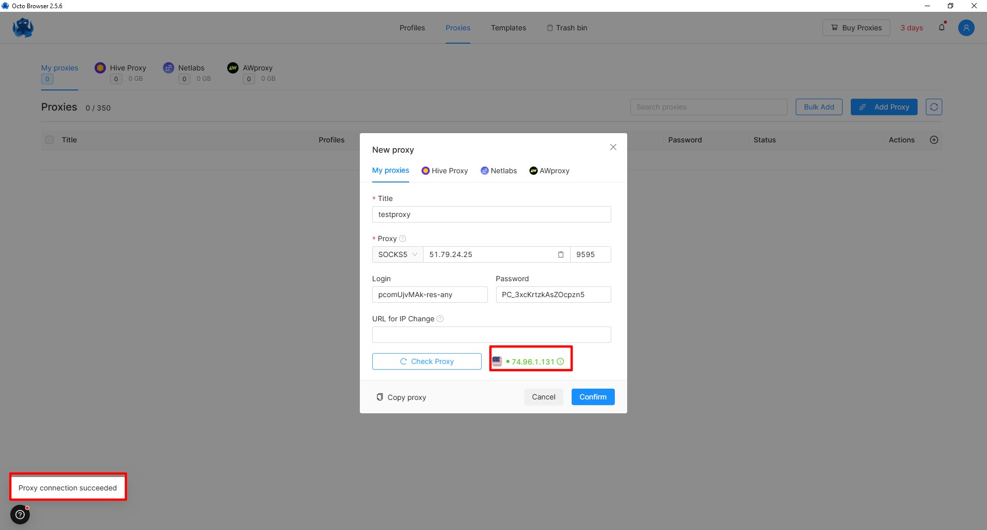 Рис. 5. Результат проверки настроек прокси-сервера в интерфейсе Octo Browser, демонстрирующий статус подключения и функциональность настроенного прокси-соединения.