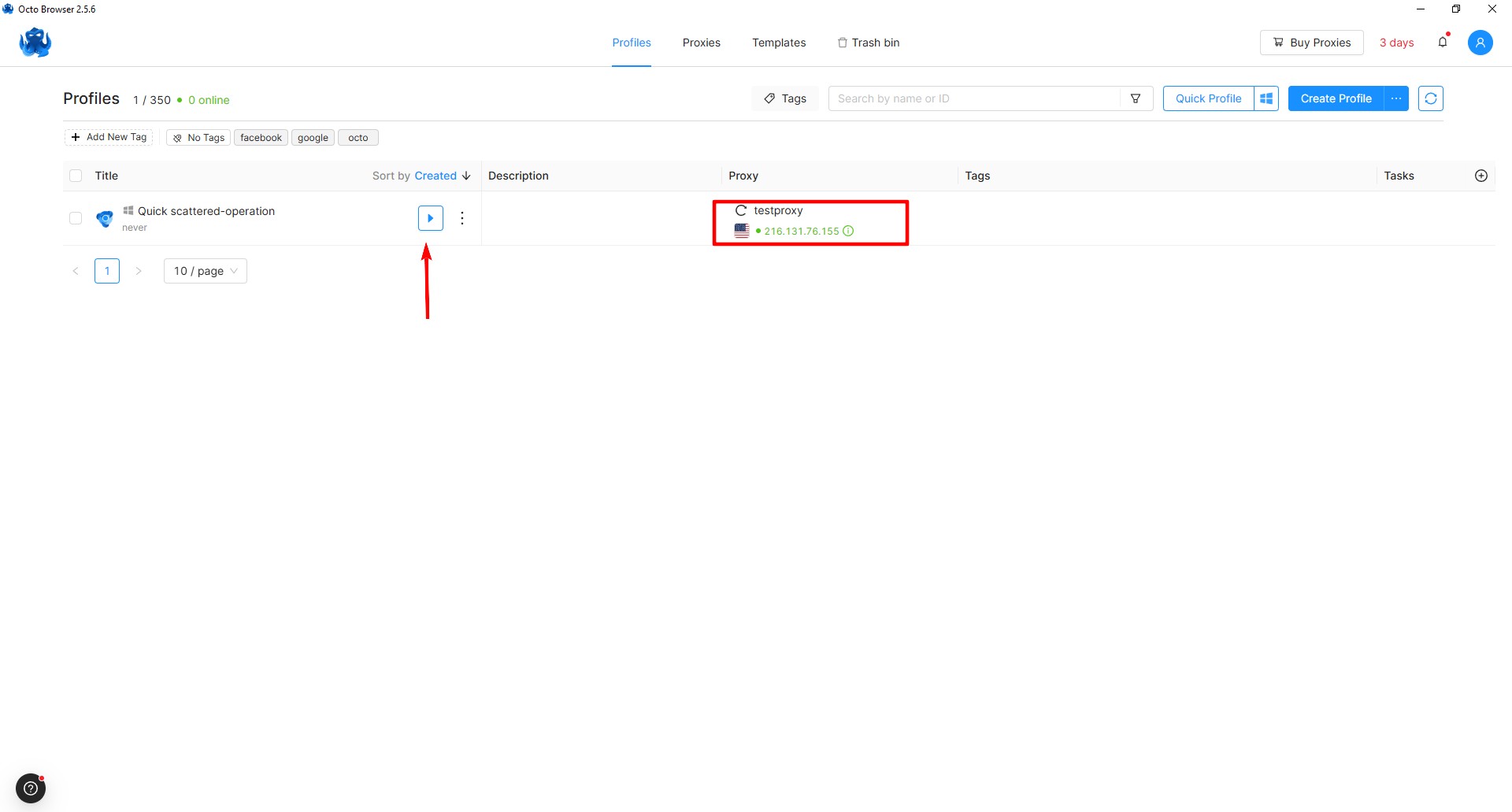 Рис. 7. Демонстрация интерфейса запуска профиля в Octo Browser, отображающая рабочую область после успешной настройки и активации пользовательского профиля с заданными параметрами прокси-соединения для дальнейшей работы на платформе.