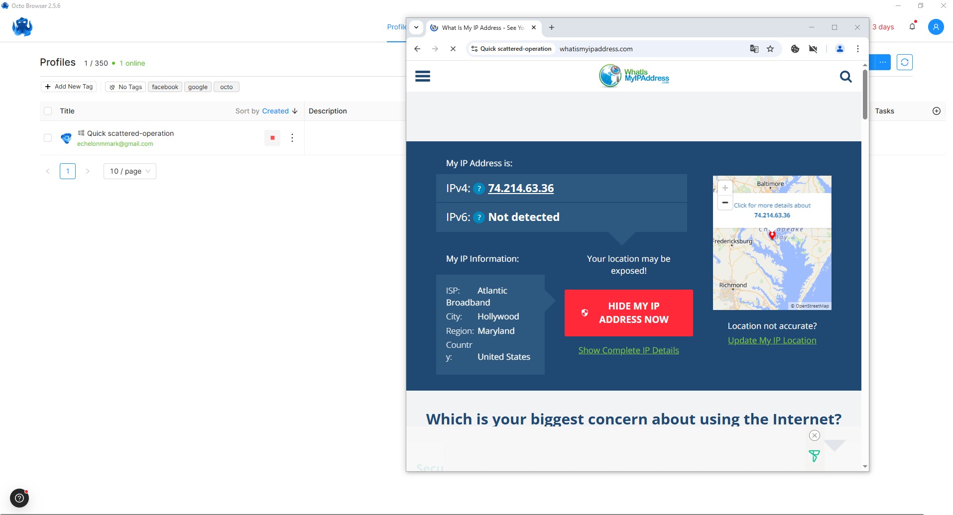 Рис. 9: Визуализация проверки IP-адреса в интерфейсе Octo Browser при активированном прокси-соединении.