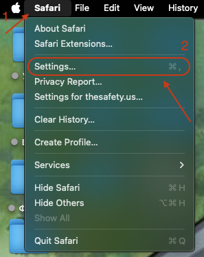 Откройте Safari. В верхней строке меню нажмите Safari -> Settings... (Настройки).