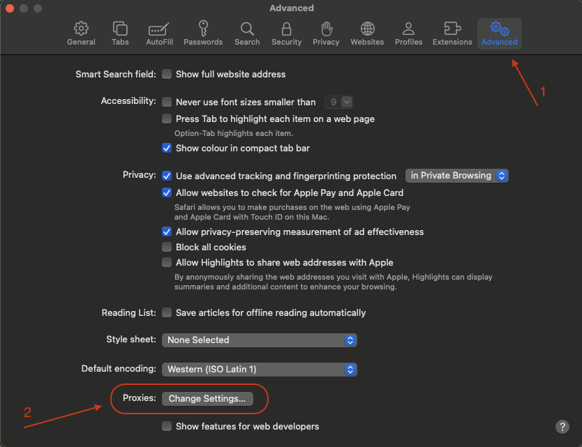 Рис. 2. Интерфейс браузера Safari на macOS с отмеченным расположением главного меню приложения, необходимого для доступа к настройкам прокси-сервера.Перейдите на вкладку Advanced (Дополнения).