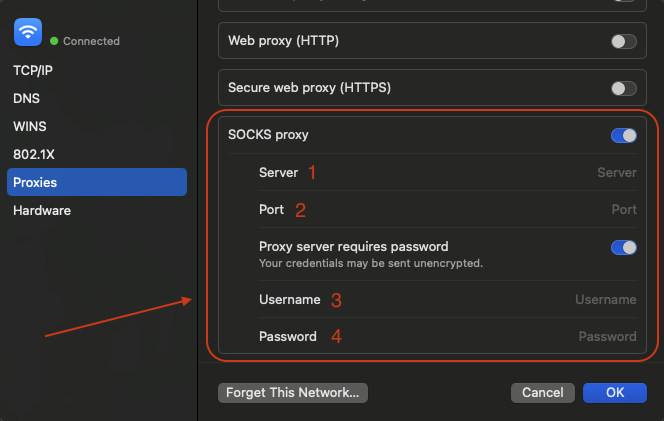 Рис. 4. Диалоговое окно системных настроек macOS, раздел «Сеть», демонстрирующее панель конфигурации прокси-сервера с выпадающим меню для выбора типа протокола (HTTP, HTTPS, SOCKS).Введите данные: