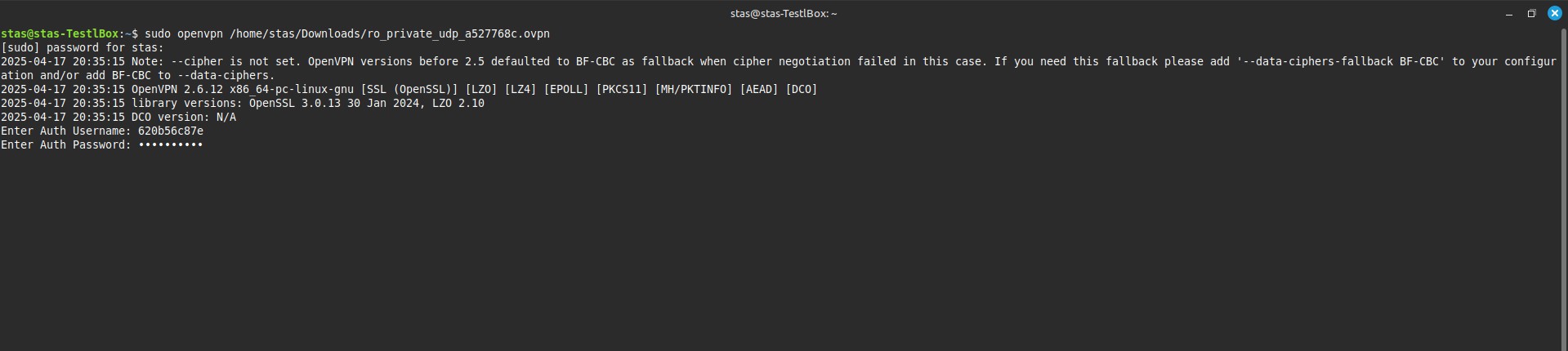 Рис. 5. Интерфейс терминала Linux, демонстрирующий процесс запуска OpenVPN с указанием пути к конфигурационному файлу через команду sudo openvpn.