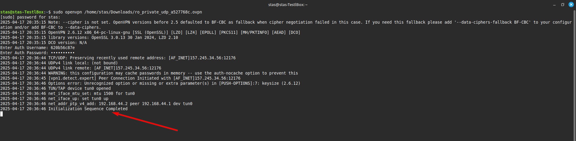 Если вы видите сообщение Initialization Sequence Completed — поздравляем, вы подключены!