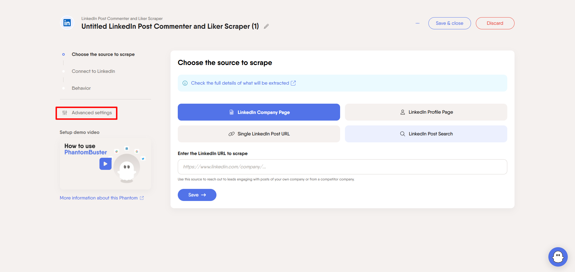 Рис. 10. Интерфейс конфигурации расширенных настроек в системе PhantomBuster. Визуализирована панель навигации с выделенным разделом "Advanced".